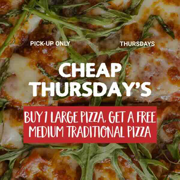 Cheap Thursday Buy 1 Large Pizza Get a FREE Medium Trad PizzaCheap Thursday Buy 1 Large Pizza Get a FREE Medium Trad PizzaAvailable day: Thursday